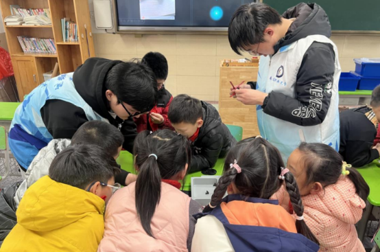 活动中,大学生志愿者们摇身一变,成为知识渊博的“科技导师”,引领着小学生们走进奇妙的机器人拼装世界,亲身体验科技动手实践的乐趣。“齿轮要卡进凹槽里,传感器连接这条线路!"三年级的孩子们围坐在课桌前,眼睛紧盯着手中的零件,在大学生志愿者手把手的指导下,一步步组装简易机器人。这些看似复杂的零件,在志愿者的耐心讲解下,逐渐化作孩子们手中的"魔法道具"。