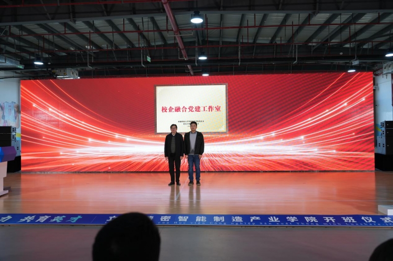 开班仪式后,在政府、学校及企业嘉宾的共同见证下,校党委委员、副校长徐胜与立讯产业学院党总支负责人为“校企融合党建工作室”揭牌,标志着双方合作从业务协同迈入党建引领、双向赋能的深度融合新阶段。此次党建工作室的成立,是学生党员发展“校企双培养人”机制的落地实施,将为职业人才培养注入强劲“红色动力”。通过校地企三方资源整合、优势互补,助力优秀学生在筑牢理想信念根基的同时锤炼过硬专业技能,成长为政治素质高、业务能力强的合格党员,为智能制造领域培育兼具“红色基因”与“工匠素养”的复合型人才,书写校企协同育人、党建引领发展的新篇章。